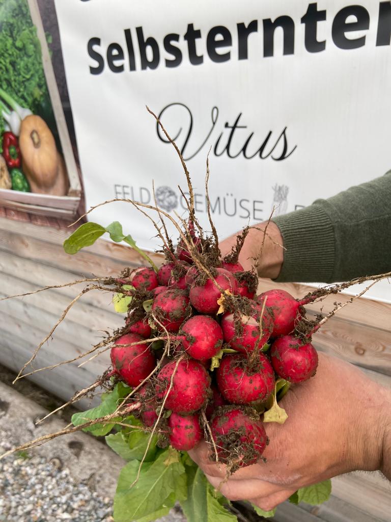 Die Idee entstand 2020/21 mitten in der Coronazeit, als die Menschen große Hamstereinkäufe machten. Zuerst musste sich Veit Wakonig gut über den Anbau informieren, dabei half ihm die Gärtnerei Seebacher. Als er sich ausreichend Wissen angeeignet hat, wurde die Setzmaschine bestellt und einfach ausprobiert. Die 0,4 ha große Anbaufläche wurde bereits auf 0,6 ha erweitert. - Der Betrieb bewirtschaftet 0,6 ha mit buntgemischten Gemüsearten nach den Biorichtlinien. Die Jungpflanzen werden von der Gärtnerei Wunder oder der Biogärtnerei Seebacher zugekauft. Von Salaten, Fenchel, Chili und Brokkoli bis hin zu Melonen, Brombeeren und Physalis ist alles dabei. An jedem Gemüsebeet ist mit einem Schild bzw. mit Beschriftung gekennzeichnet, ob geerntet werden kann. Auch bei der Preisliste ist mit roten und grünen Punkten erntereifes Gemüse markiert. Gemischte Gemüsekisten gefüllt mit saisonalem Gemüse direkt vom Erntefeld können in den angrenzenden Gemeinden wöchentlich bestellt werden. Sie werden freitags im Einwegkarton (18€) direkt vor die Haustür geliefert. Was nicht verkauft wird, kommt den Hühnern bei Veit Wakonig zu Hause zugute.