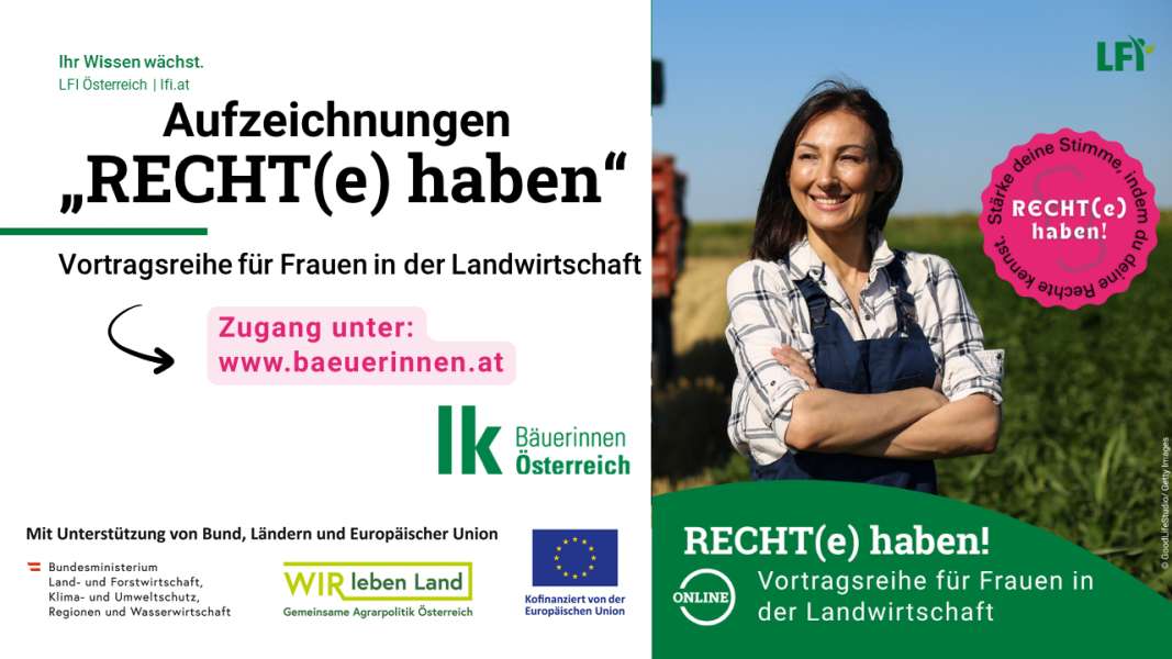 Die Online-Reihe vermittelt praxisnahes Wissen zu wichtigen rechtlichen und sozialen Fragen im bäuerlichen Alltag – speziell zugeschnitten auf Frauen, die in Hof, Familie und Betrieb Verantwortung tragen. Die Inhalte reichen von den rechtlichen Spielregeln am Hof über Familien- und Erbrecht, Hofübergabe und Sozialversicherung bis zu Mutterschaftsleistungen und Steuertipps.