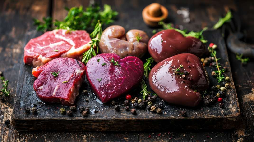 Essbare Innereien wie Herz, Leber, Nieren oder Zunge weisen häufig eine signifikant höhere Nährstoffkonzentration und eine höhere Proteinqualität auf als der klassische Skelettmuskel. Sie fungieren als natürliche Konzentrate essenzieller Mikronährstoffe, enthalten viele Vitamine & Mineralstoffe und sind damit eine exzellente Quelle für Vitamin A, B12, Eisen und Zink.
